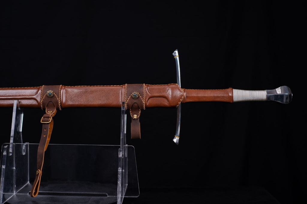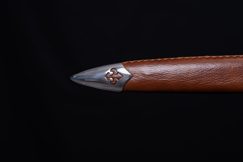 Fourreau : Fabriqué en bois et entièrement recouvert de cuir de vache, il est à la fois fonctionnel et élégant, assurant une protection optimale de la lame hors combat.