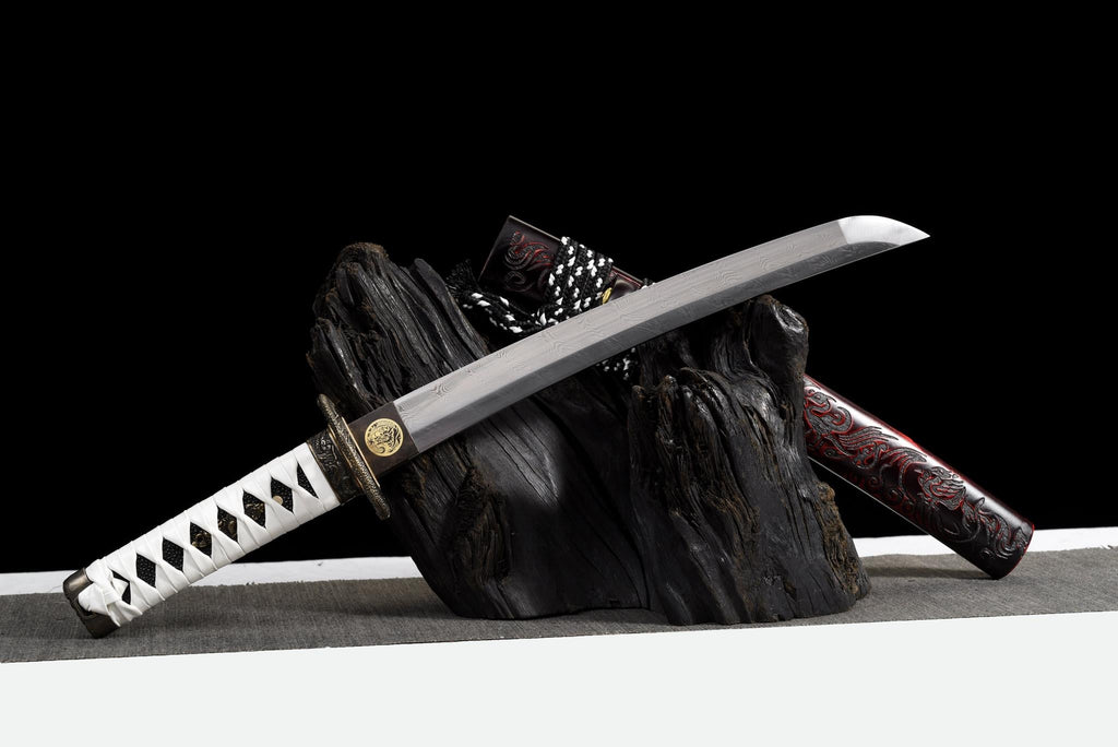 Forgé en acier de Damas stratifié et équipé d'ornements en alliage détaillés, ce tanto unit raffinement et résilience. Les motifs de vague de la lame reflètent le flux de l'eau, tandis que le fourreau gravé évoque le feu — un équilibre des opposés en parfaite harmonie.