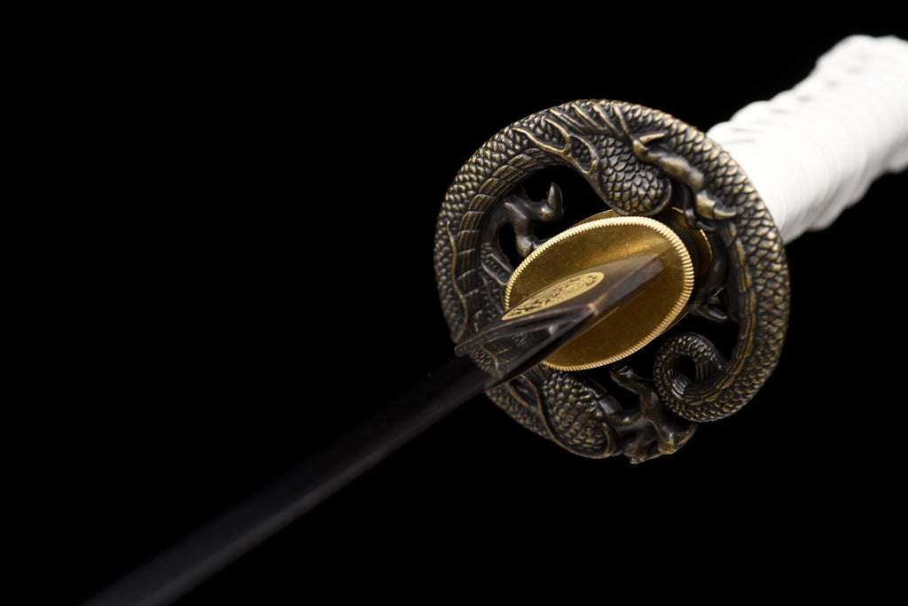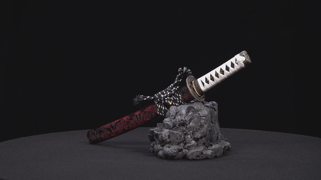 Le Byakko no Tanto, signifiant « Tanto du Tigre Blanc », symbolise la pureté, la précision et la force silencieuse. Sa poignée blanche contraste de manière frappante avec le saya sculpté rouge et noir profond, créant une image de puissance calme et de dignité intemporelle.