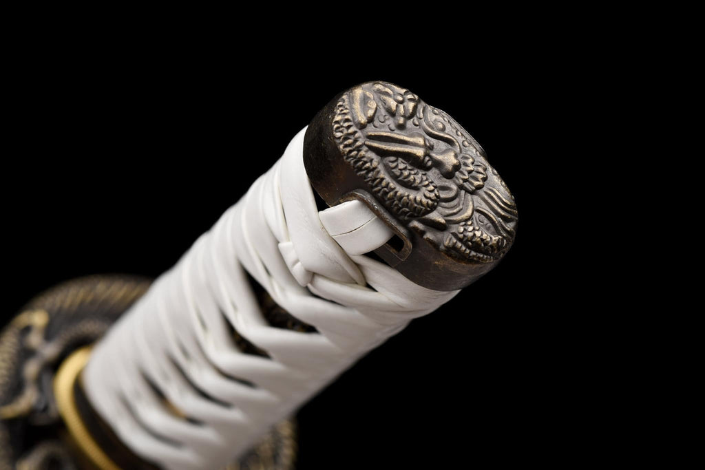 Noyau en bois enveloppé dans un ito blanc pur sur samegawa noir (peau de raie), combinant un contraste visuel raffiné avec une prise sécurisée et un excellent équilibre. |