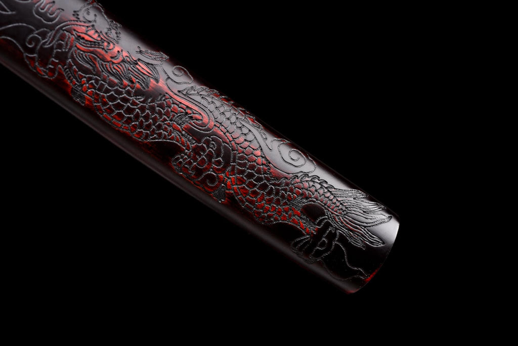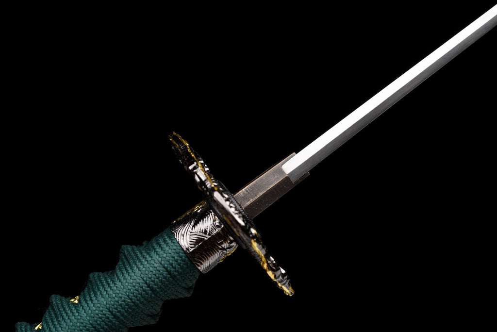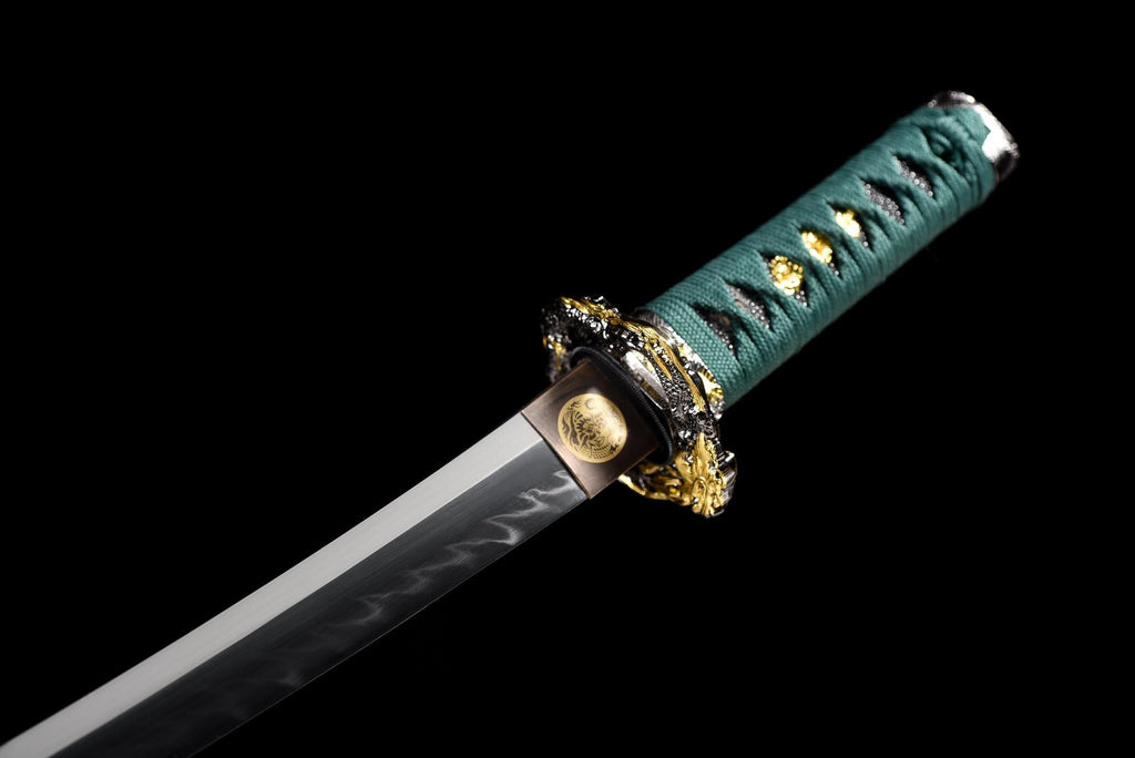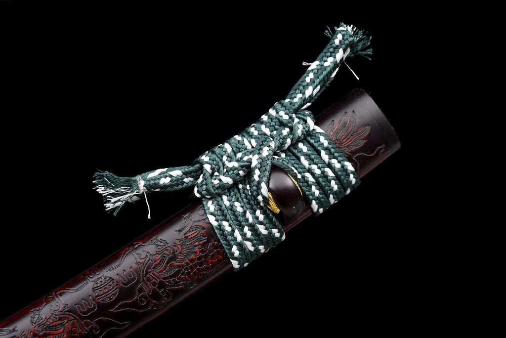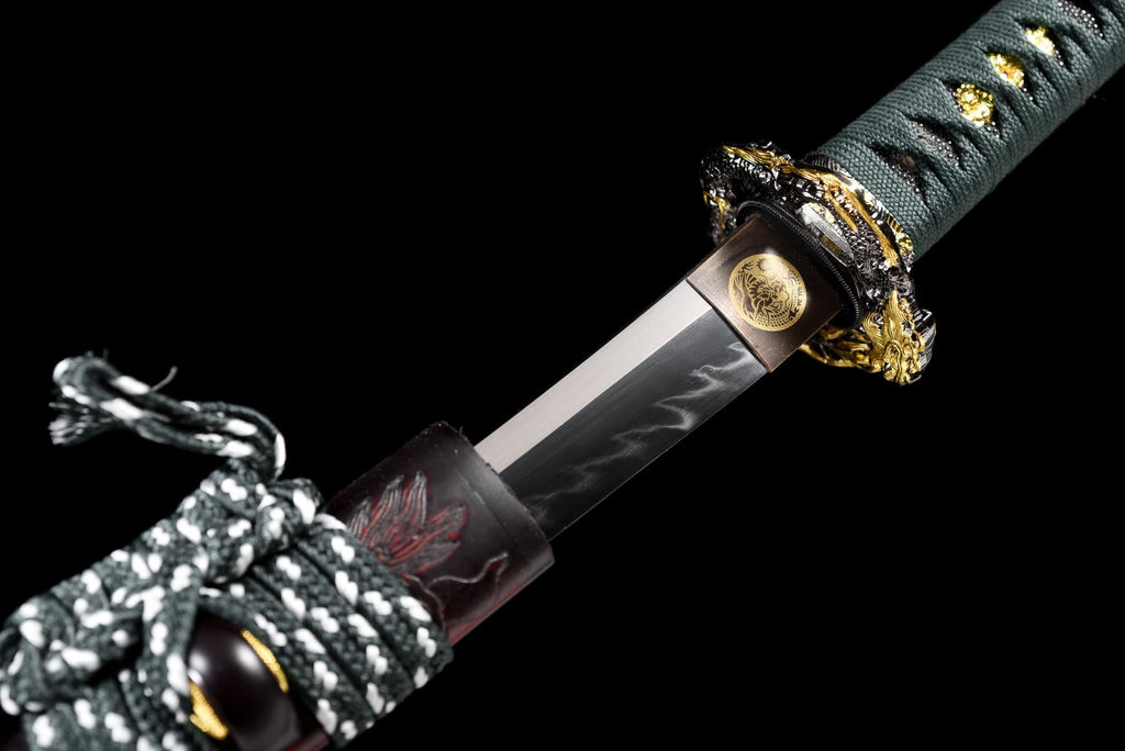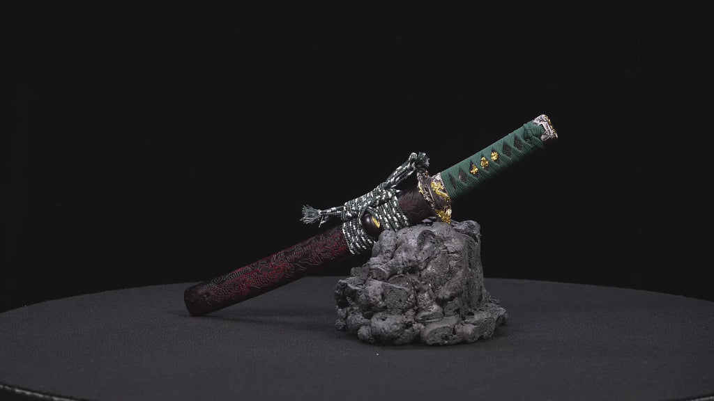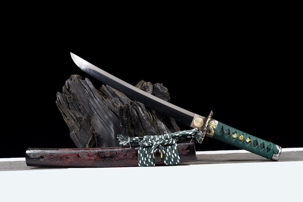 Forgé en acier T10 à haute teneur en carbone et poli pour révéler un hamon clair, ce tanto se dresse comme un symbole de résilience et de discipline. L'harmonie de couleurs élégante entre le tsuka vert et le saya rouge-noir sculpté en fait à la fois une lame fonctionnelle et une œuvre d'art.
