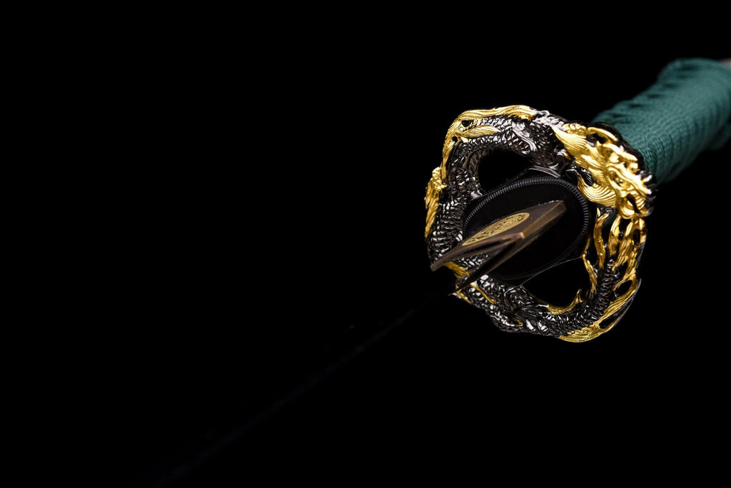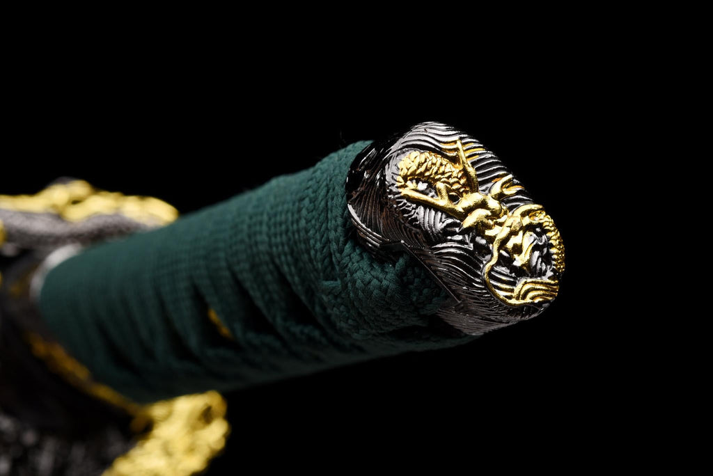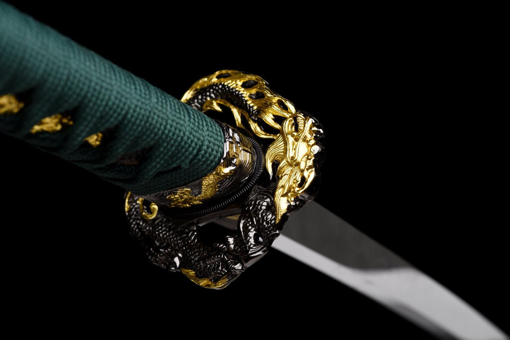 Noyau en bois enveloppé dans un ito vert forêt sur samegawa noir (peau de raie). Des menuki dorés accentuent la poignée, ajoutant un contraste subtil et une touche luxueuse. |
