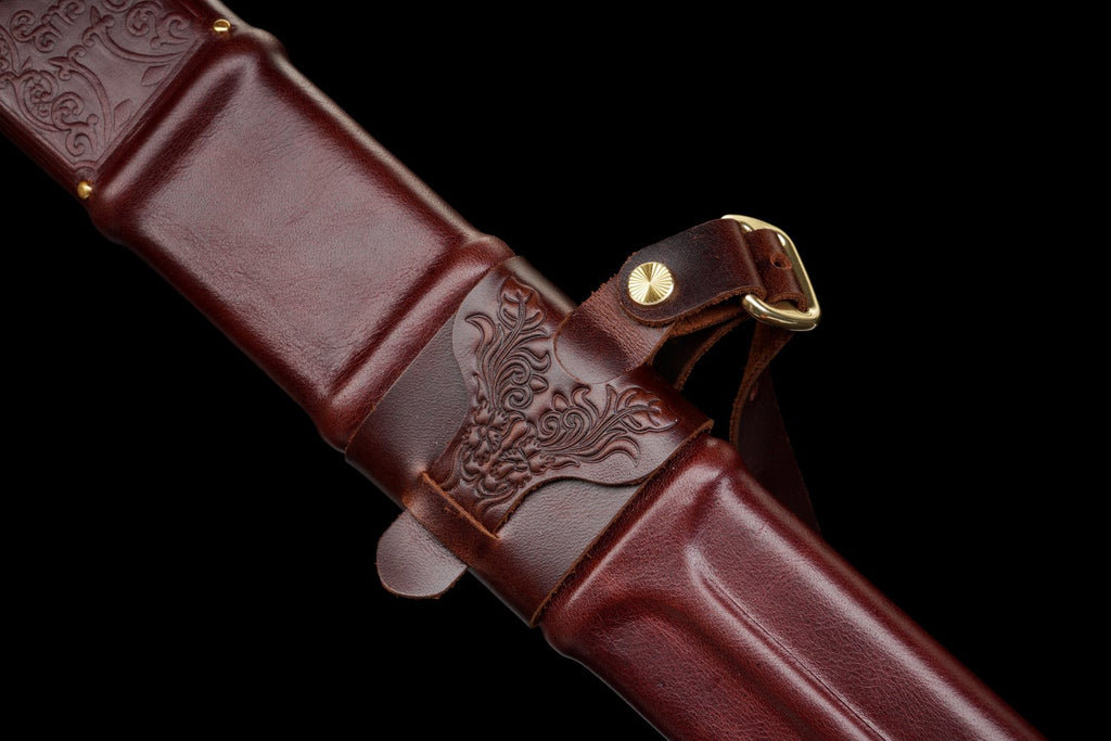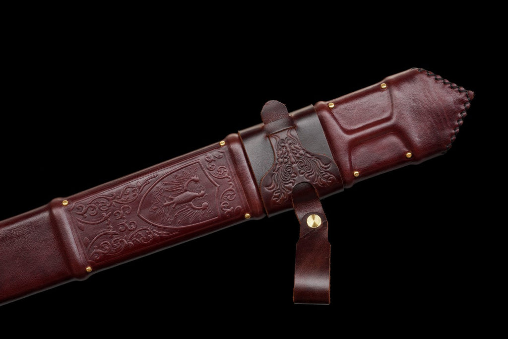 La poignée en wood + genuine cowhide leather assure une prise sûre et confortable, et le fourreau en wood + genuine cowhide leather ajoute une touche médiévale authentique qui complète parfaitement l'ensemble de la pièce.