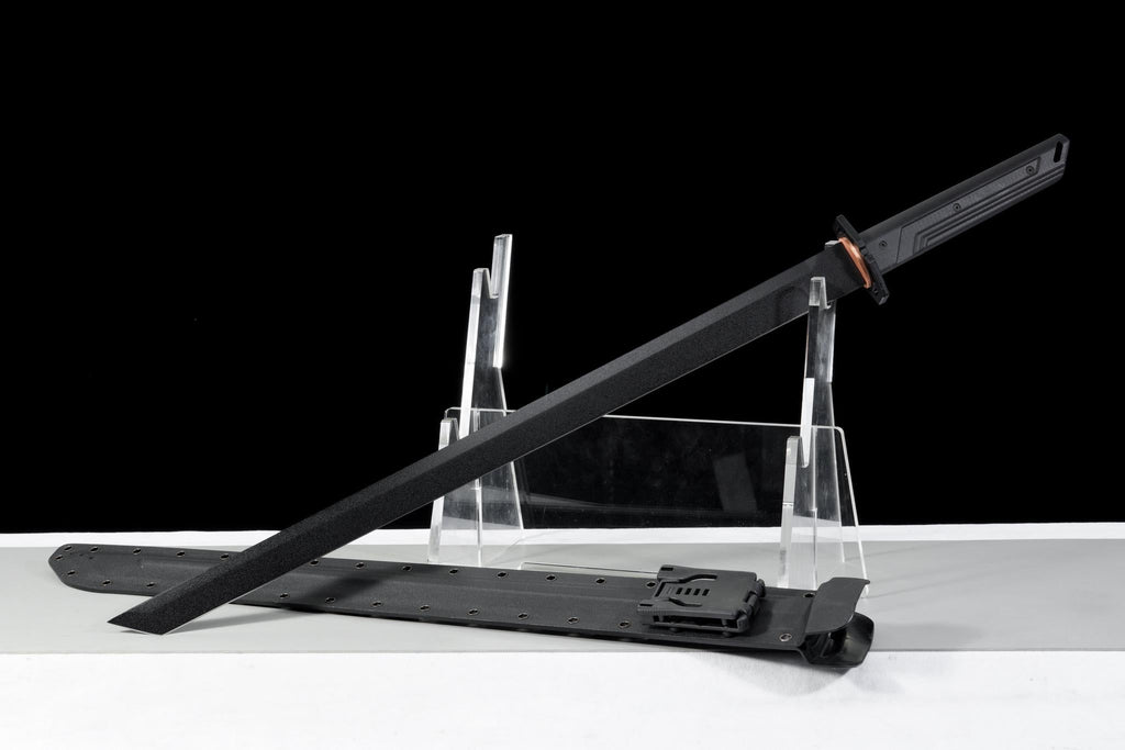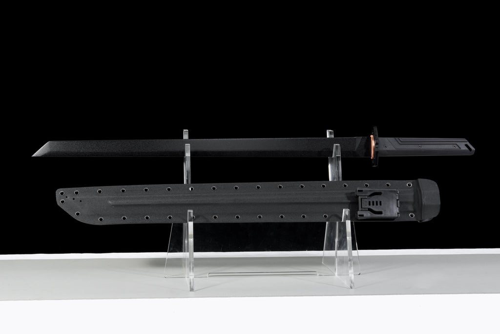 L’épée est fournie avec un fourreau en Kydex moulé sur mesure, équipé de multiples points de fixation et d’un clip de verrouillage sécurisé. Ce fourreau léger assure un port sûr, un déploiement rapide et une rétention solide, même lors de mouvements intenses.