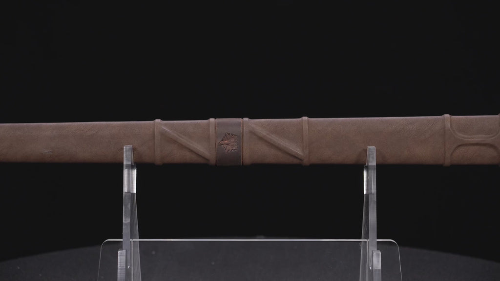Le symbole de loup embossé sur le fourreau évoque l’esprit ancien de fraternité et de courage — la marque des guerriers qui ne combattaient jamais seuls. Chaque détail, du cuir cousu de la poignée à l’éclat froid de la garde en acier, incarne la force forgée par la tradition.