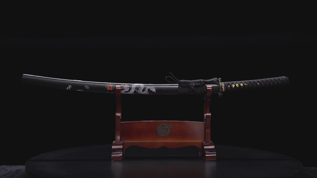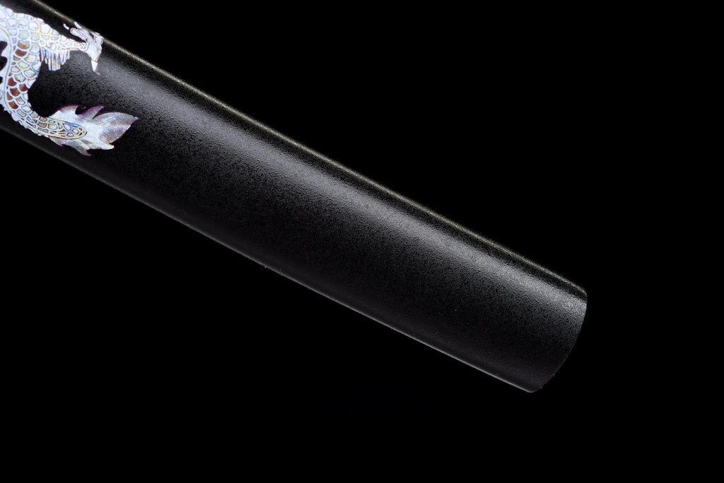 Les montures en alliage présentent des représentations traditionnelles de dragons en noir et or, renforçant le thème céleste de l’arme. La tsuba est sculptée avec des détails ornés, tandis que le fuchi et le kashira complètent l’ensemble avec des finitions raffinées inspirées du travail des métaux japonais classiques. Le saya, quant à lui, est recouvert d’une laque noire profonde et décoré d’un superbe dragon façon nacre poursuivant la perle sacrée, offrant un fourreau lumineux et haut de gamme.