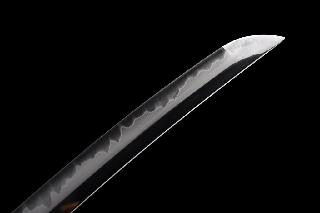 Forgée en acier T10 de haute qualité avec un midare hamon distinct (motif de vague irrégulier). Le poli miroir de la lame et son grain raffiné mettent en valeur la maîtrise du traitement thermique, combinant tranchant, flexibilité et résilience. |
