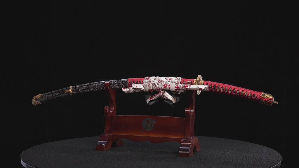 Le Akatsuki no Tachi, signifiant « Tachi de l'Aube », est un chef-d'œuvre royal qui incarne la splendeur et le raffinement de l'élégance traditionnelle des samouraïs. Sa poignée rouge radieuse, ses garnitures dorées complexes et son saya samegawa noir raffiné évoquent l'image de la lumière de l'aube se levant sur le champ de bataille — un symbole d'honneur, de renouveau et de victoire.