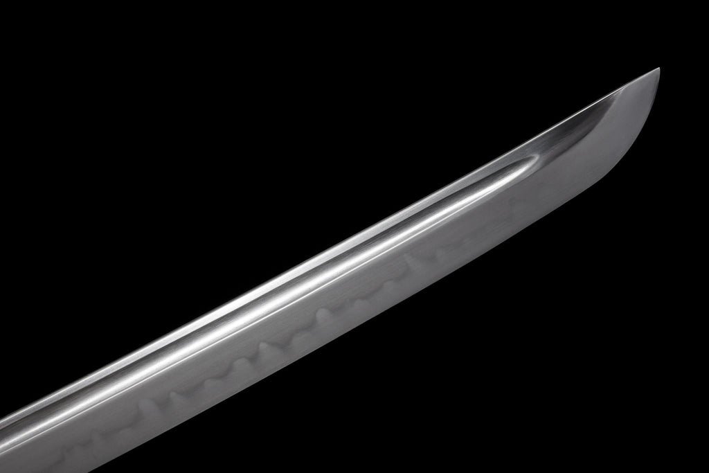 Poignée Enveloppée de Soie Authentique : Le tsuka (poignée) est enveloppé de soie noire traditionnelle dans un motif tressé, offrant une prise confortable et sécurisée.