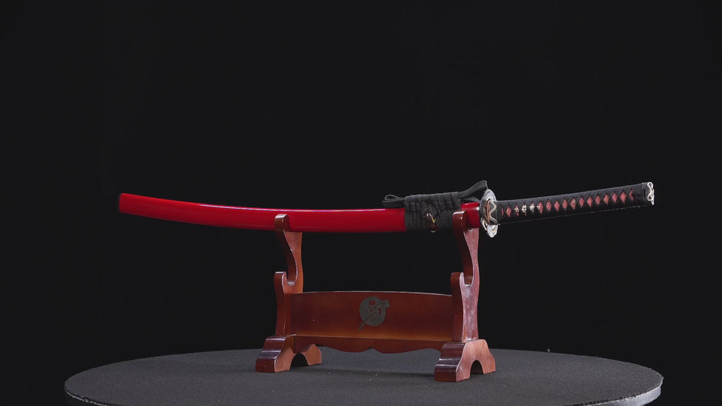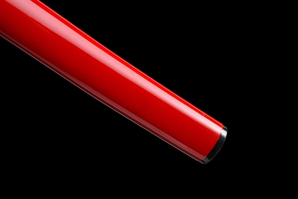 Saya rouge brillant laqué à la main (style urushi) symbolisant le feu et l'esprit. Associé à un sageo noir et des garnitures de style corne, il crée un contraste saisissant entre élégance et intensité. |