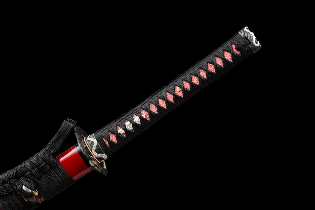 Noyau en bois enveloppé dans un ito en coton noir serré sur du samegawa cramoisi profond (peau de raie). Rehaussé de menuki en forme de serpent détaillés pour la prise et le style, assurant à la fois confort et contrôle supérieur lors de la manipulation. |