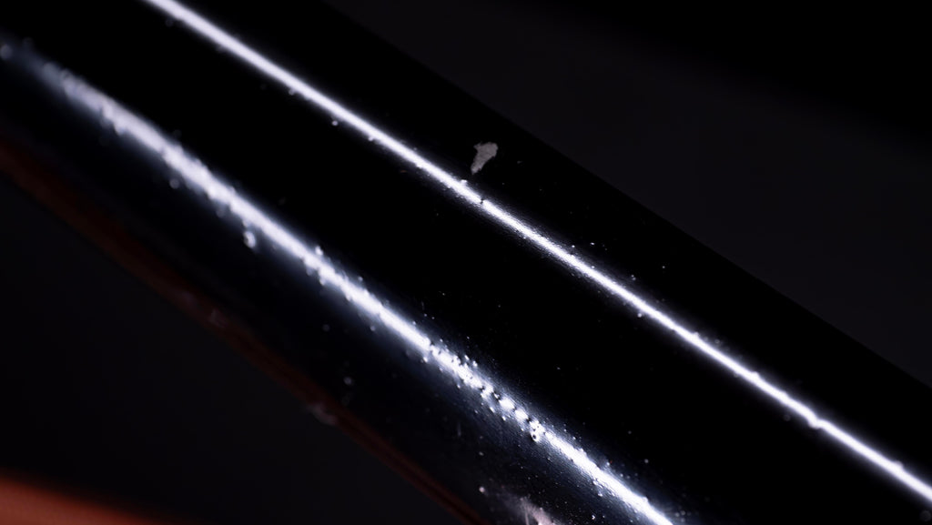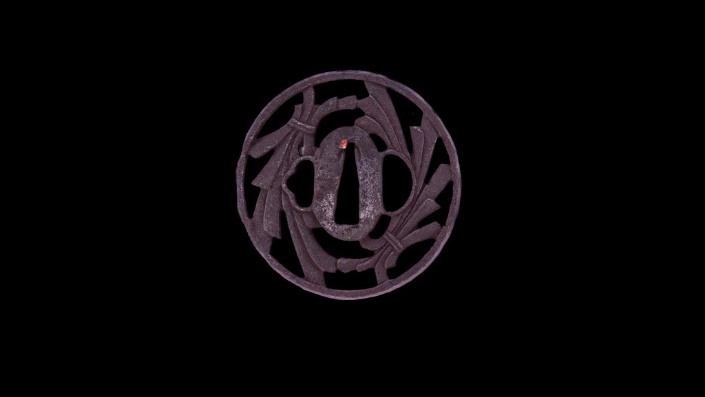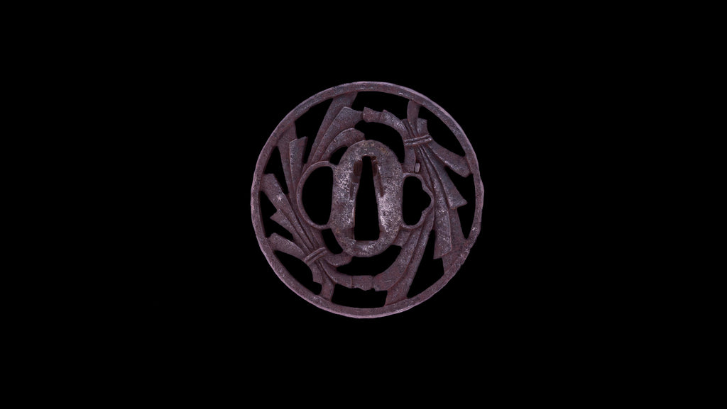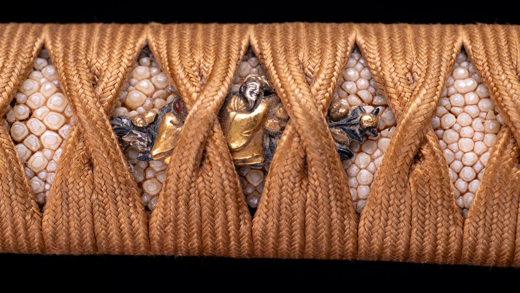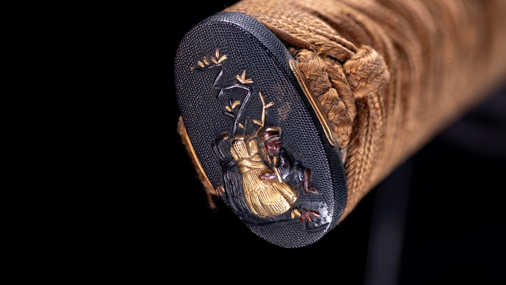 Le sabre est orné d'une monture thématique célébrant l'Inaho (la récolte du riz), symbole de richesse et de protection divine dans la culture japonaise. La tsuba est une pièce magistrale en fer ajouré (sukashi) représentant des gerbes de riz mûrissant. Ce motif se poursuit élégamment sur les menuki et le fuchi-kashira, qui présentent des sculptures en haut-relief de fermiers et des scènes d'abondance. Le saya bénéficie d'une finition en laque noire profonde et lustrée, offrant une esthétique sobre mais de haut rang qui complète parfaitement l'tsuka-ito en soie dorée.