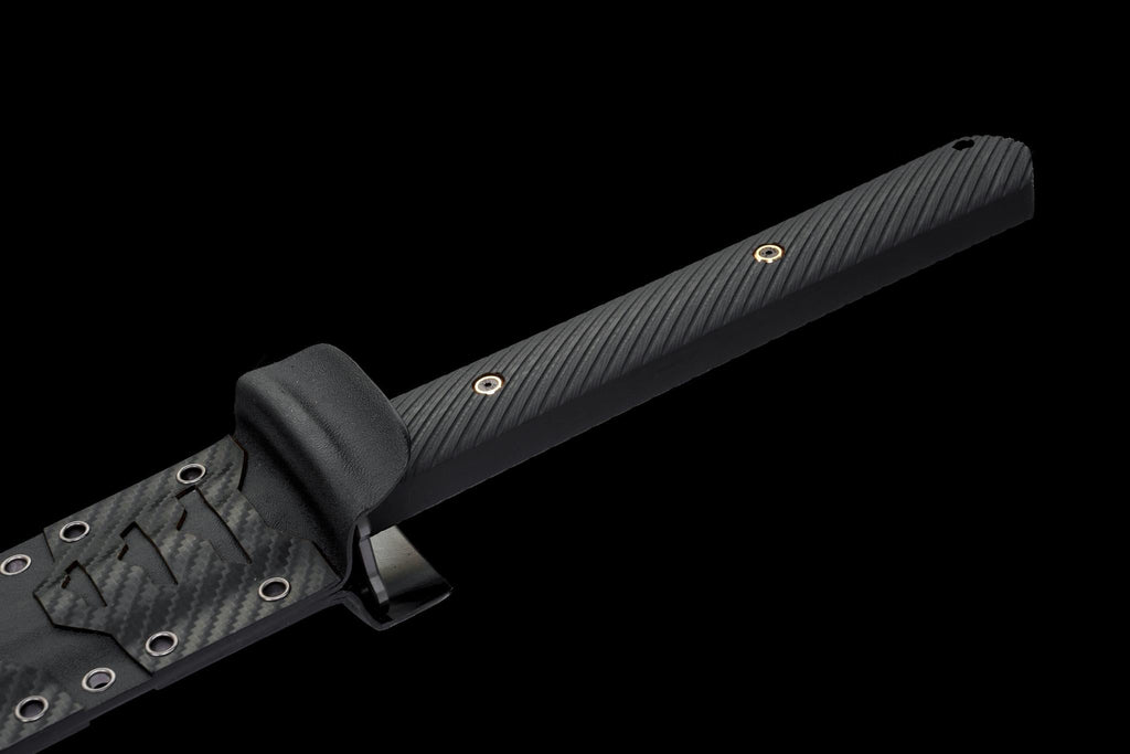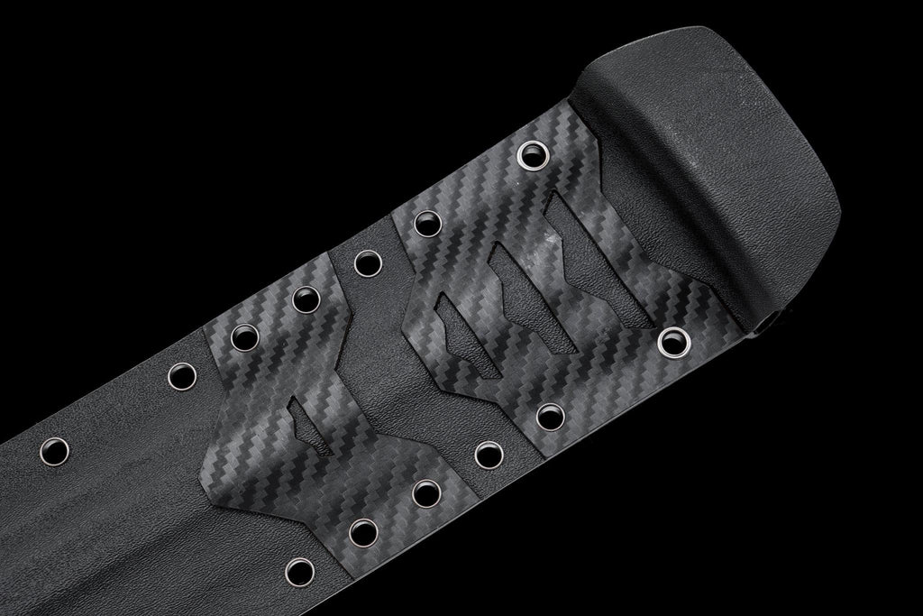 Chaque Frappe du Néant est livré avec un fourreau premium en Kydex, doté d’un motif façon fibre de carbone et d’œillets renforcés permettant de multiples options de port. Fixé à une ceinture, un sac ou un gilet tactique, le système d’emport garantit une rétention fiable et un déploiement rapide.