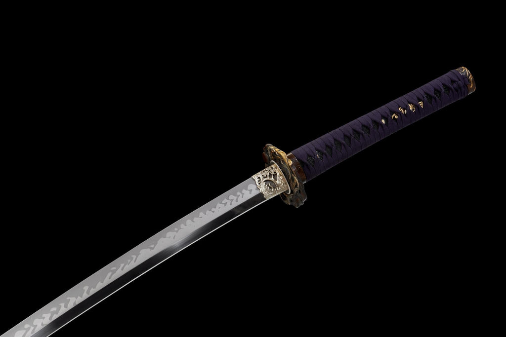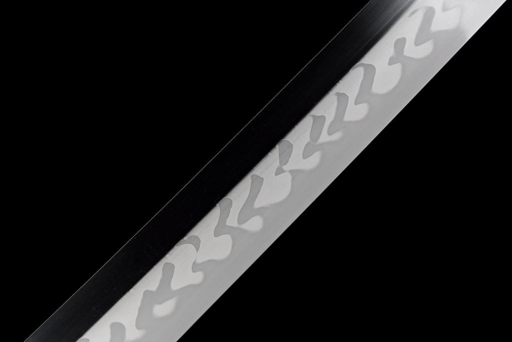 Poignée Enveloppée de Soie Authentique : Le tsuka (poignée) est enveloppé de soie traditionnelle dans un motif tressé élégant, offrant une prise confortable et sécurisée.