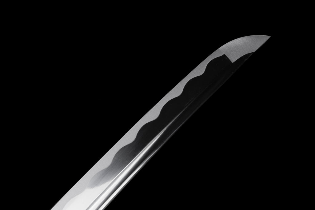 Lame : Forgée en acier 1060, la lame polie révèle un hamon saisissant, alliant robustesse et esthétique. Parfait pour l’exposition et la pratique légère de coupe.
