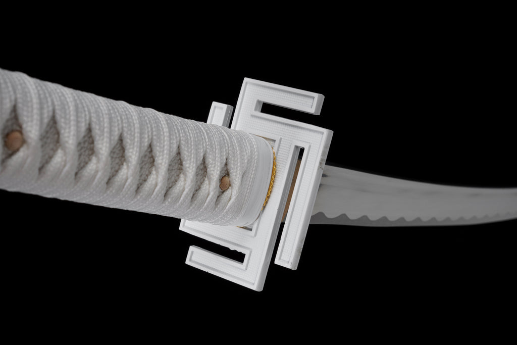 Manche (Tsuka 柄) : L’enroulement blanc intégral sur peau de raie offre une prise ferme et s’accorde parfaitement au style minimaliste et puissant de l’arme.